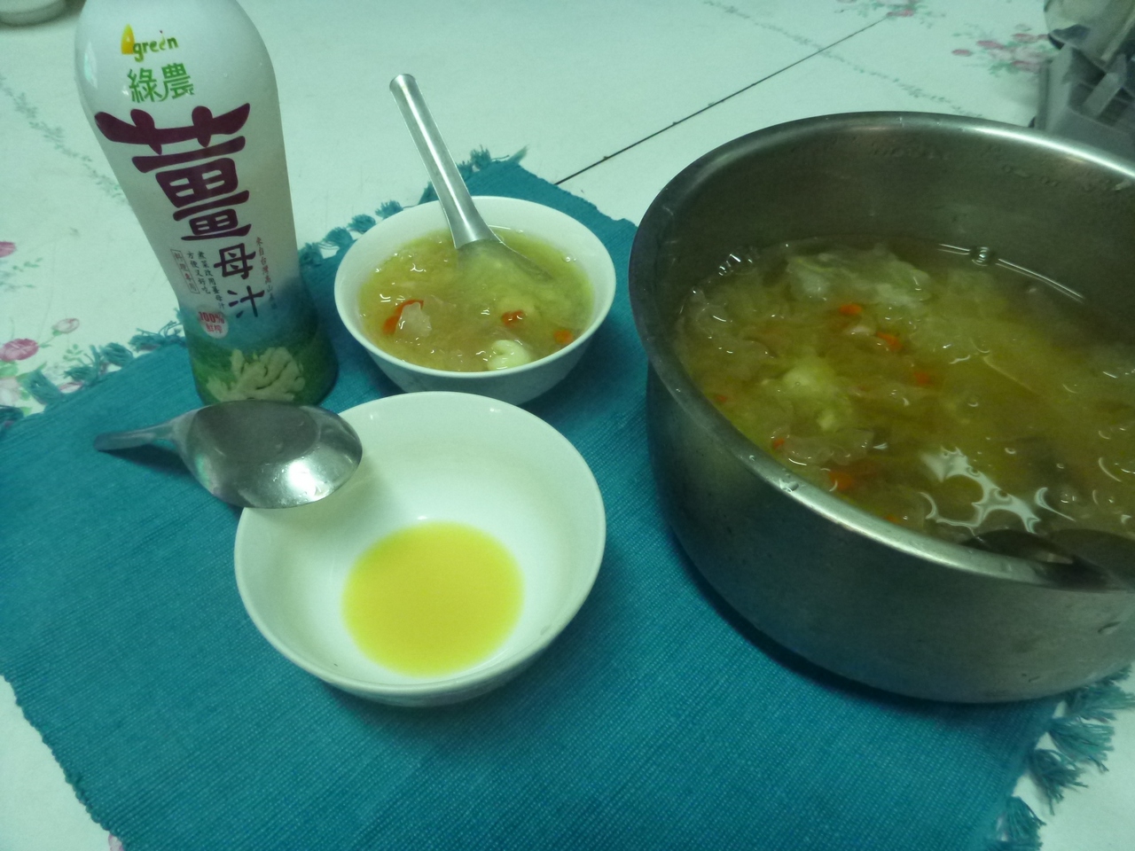 手上剛好有綠農的薑母汁,綠農薑母汁是用高山的新採竹仔薑3斤搾成300公克,放入玻璃瓶中保存。有句俗語:「冬吃蘿蔔夏吃薑,不勞醫生開藥方。」、「早上三片薑勝過人蔘湯」。且不管薑有多神妙,我的經驗是將薑放入冰冷的果汁,胃就不會那麼怕冷。所以,冰涼過的銀耳蓮子湯我也放了綠農薑母汁,喝起來多了薑 的香味而映像中薑的嗆辣卻消失了。所以,加了薑母汁的薑味銀耳蓮子湯真是好吃又顧胃。