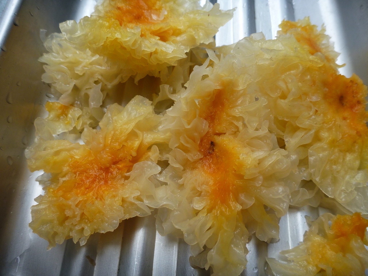 將銀耳放入電鍋中加一杯水蒸煮,試了一下,濃濃的生味,於是再加一杯水蒸煮第二次,生味不見了,但銀耳的膠質只溶出一點點,不過可以接受,就不再蒸煮第三 次了。因為一次做10人份一鍋,吃不完的,下次再吃時會再蒸煮,那時膠質就會釋放出來。其實,銀耳的膠質是水溶性的,擺放越久膠質溶出越多,實在不須多次 蒸煮。